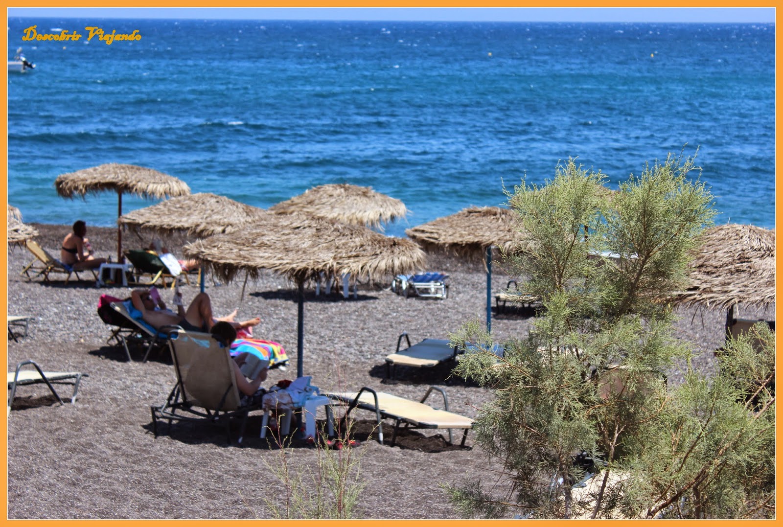 A Praia de Kamari é a praia mais conhecida da zona leste da ilha, e quando lá chegámos vimos uma praia lindíssima, mas muito diferente ao que estamos habituados. Em vez de areia tínhamos pedra vulcânica e aí percebemos que teríamos que alugar um chapéu de sol, pois seria impossível estar em cima pedra com o calor que se fazia sentir. A ida à água foi uma verdadeira luta, pois a pedra queimava horrores, e para remediar a situação colocámos as toalhas debaixo dos pés e arrastámo-nos até à água.